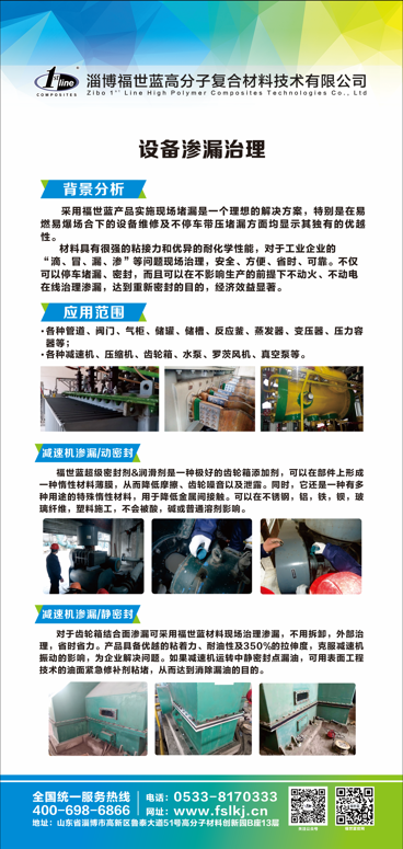 福世蓝高分子聚合物材料基材树脂采用美国航天级化工集团豪斯曼旗下“阿克”化工公司生产的核级树脂为原料,加以纳米级金属微粒、陶瓷微粒和碳纤维等材料精工合成,在物理性能及化学性能方面都是优良的水平,它与一般的金属修补剂和工业胶粘剂有着根本的区别。高分子聚合物复合材料是以高分子聚合物、金属微粒、陶瓷粉末和碳纤维材料组成的双组分或多组分的复合材料,是在高分子化学、有机化学、胶体化学和材料力学等学科基础上发展起来的高科技学科。配置了事前预防、过程维护、事后维修三位一体设备管理体系,并根据不同的设备问题适配了多种技术解决专案。